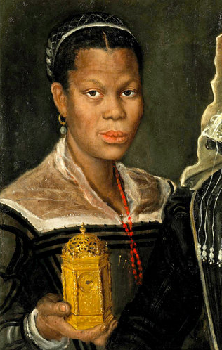 This portrait of an African slave was painted during the 1580s. Tiny pins in the front of the subject’s dress indicate that she was a dressmaker. The original painting was likely damaged, leaving the master cut out of the picture and the slave now framed as its primary subject. “Portrait of an African Slave Woman,” Annibale Carracci (attributed), Tomasso Brothers, Leeds