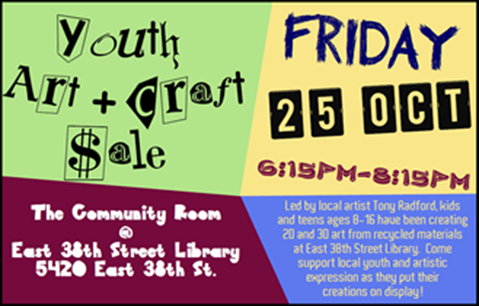 Led by local artist Tony Radford, kids and teens ages 8-16 have been creating 2D and 3D art from recycled materials at East 38th Street Library. The kids have been working real hard for the past couple of months on their pieces, so come support local youth and artistic expression as they put their creations on display!