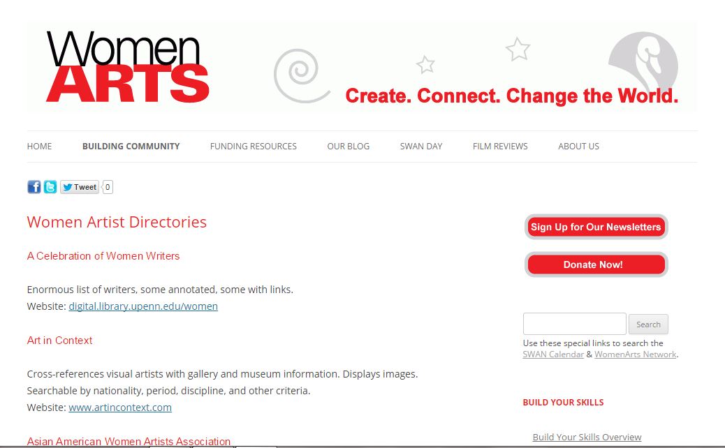 WomenArts is a worldwide community of artists and allies that works for empowerment, opportunity, and visibility for women artists. We provide a variety of free online networking, fundraising and advocacy services, and we organize Support Women Artists Now Day (SWAN Day), an annual international holiday celebrating women’s creativity in all its forms. We believe in the power of women artists to create, connect, and change the world.