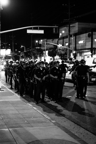 Minneapolis, MN : Police officers standing guard towards George Floyd protestors in minneapolis riots