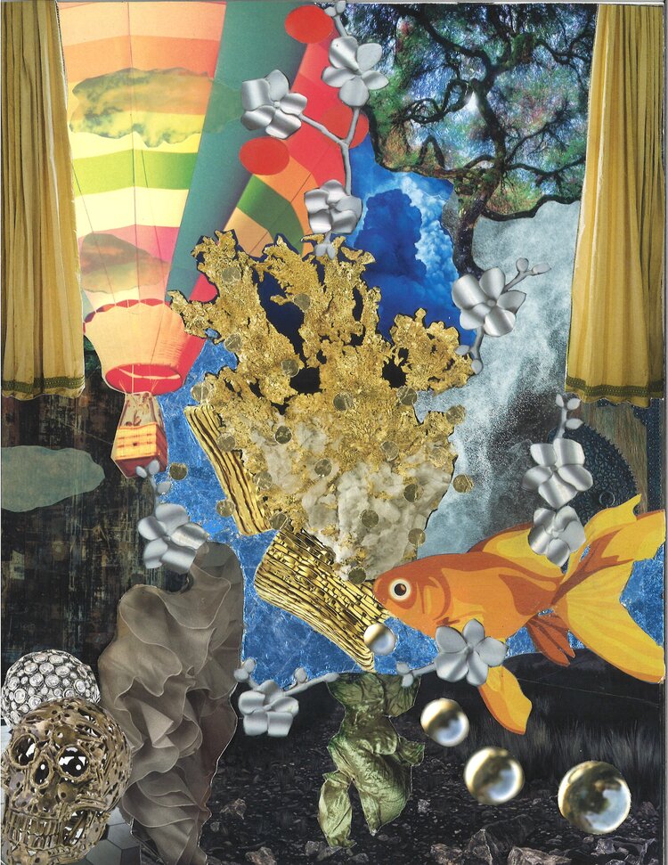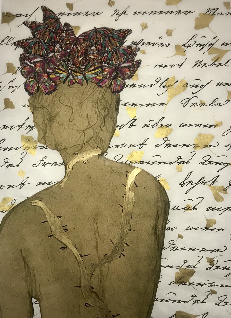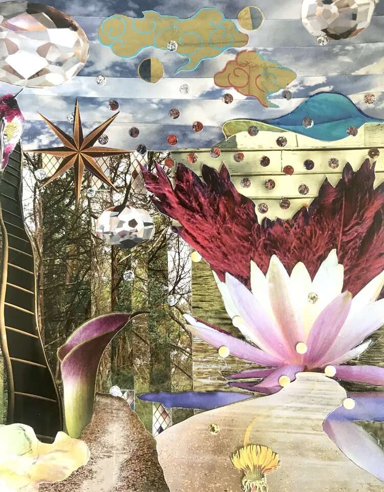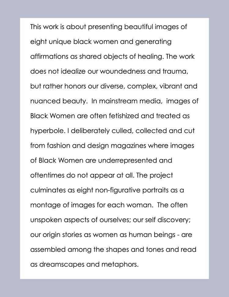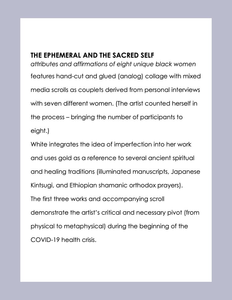 “As a Black Woman, I felt strongly compelled to listen, record and elevate the unique and sublime characteristics of these Black Women. Pre-Covid, we would have met in-person to form a circle of support; to share – to heal. In lieu of an in-person gathering, I called each women separately. Highlighting our isolation, our interactions were lo-tech and over the phone. Each conversation was prompted by a set of questions designed around this moment (2020) and individual ideas about self: self-care, self-love, and self-power. The process resulted in a duo of works created about each woman: one collage and one literary (scroll) work together as the unseen and underrepresented expressions and experiences of each unique Black Woman.”