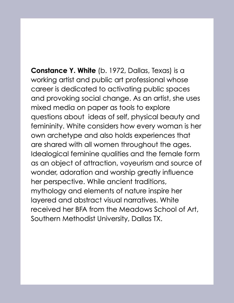 “Constance Y. White was born in Dallas and lived much of her formative years with her family, in the Piney Woods of rural East Texas. She is a graduate of the Meadows School of Art which led her to becoming the first Public Art Coordinator for the City of Dallas. After nine years, she went on to launch a comprehensive arts program at San Diego International Airport. She returned to her home in Dallas after eight years there. As an arts administrator, Constance has worked with both public and private organizations in Texas, DC, Southern California, Alabama and the Carolinas.”