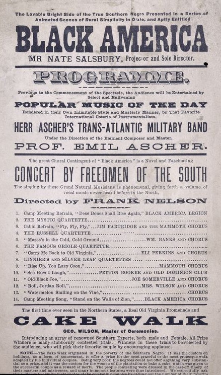 These themes of nostalgia and progress surfaced in specific performance forms. The cakewalk was well known in the North, but audiences of Black America perceived it as something entirely different: the authentic cakewalk of Southern heritage. Developed originally by enslaved people as a satirical masquerade mocking the stilted promenades of their upper-class enslavers, the cakewalk shifted into a more stylized promenade competition dance, commonly added as an act to minstrel shows by both Black and White performers. The “‘Ole Virginny’ cakewalk [featured in Black America was] something quite different from the fancy cakewalks the people of the North ha[d] been in habit of seeing”, a performance difference chalked up by Northern viewers to a sign that they were witnessing the cakewalk in its original form.21