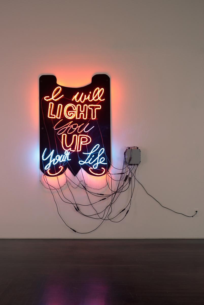 Los Angeles-based artist Cauleen Smith’s flashing neon sculpture Light Up Your Life (For Sandra Bland) alternates between “I will light you up,” the words shouted to Sandra Bland by a Texas State Trooper, and “I will light up your life,” lyrics from the 1970s hit famously sung by Debby Boone and later Whitney Houston. About the artwork, Smith said: “I wanted to play with this threat, ‘I will light you up,’ by finding a response that neutralized it… And so, this flashing neon is a dance off, a sing-a-thon, a battle, a protest, a memento mori that collectivizes Sandra Bland’s resistance, reclaims her sovereignty, and reifies the ways in which Black culture is inextricably woven into national identities and cultures.”