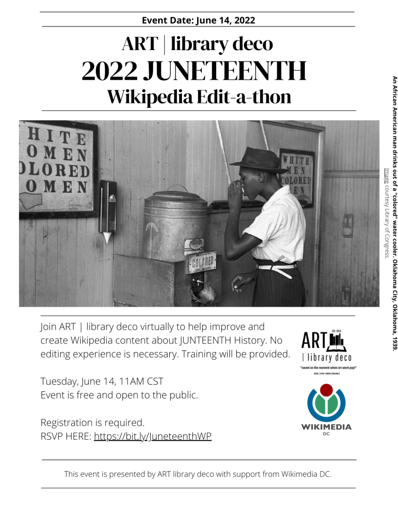 Join ART | library deco for our second Wikipedia Edit-a-thon! We will explore and update articles about JUNETEENTH. If you are new to editing articles using Wikipedia, want the experience, and have the time to learn a new skill attend this event in celebration of the holiday. *Free event and sitting is limited.