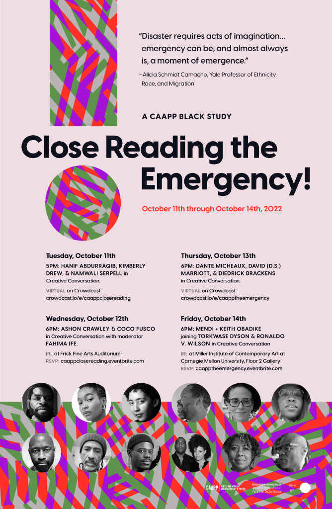 What do we have to say back this brutal discourse in our close reading? Close reading, is of course, a textual engagement of interpretation, but it can also be thought of in the black queer colloquialism of reading, like that Zebra Katz takes up in his work, “Ima Read.” What are these different contemporary emergencies, and how might we (and our guests) read them?