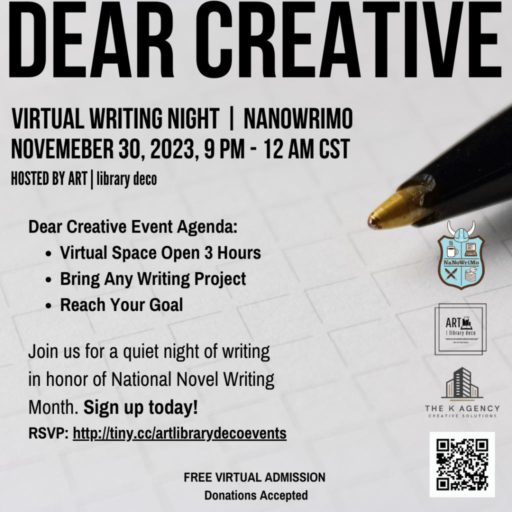 Come and be a part of ART | library deco’s DEAR CREATIVE virtual writing session as we celebrate the final day of National Novel Writing Month! This exclusive event is open to our valued library subscribers, library art patrons, and the entire writing community! Spread the word to your connections and join us in this virtual creative writing space, whether you’ve been writing for the entire month or just a single day. Let’s conclude NaNoWriMo together! Write, Right!
