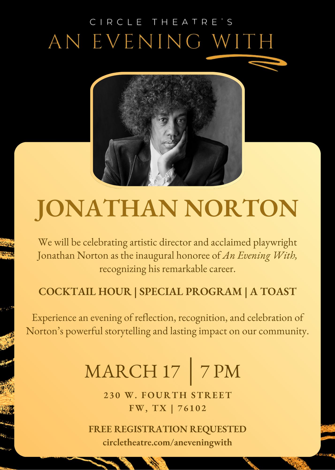 Circle Theatre will host “An Evening With Jonathan Norton” on March 17, 2025. The event will feature a cocktail hour, beginning at 7 PM, and a program showcasing Norton’s work and impact on the North Texas theater scene. Guest speakers, excerpts from his plays, and a retrospective of his artistic journey will also be featured.