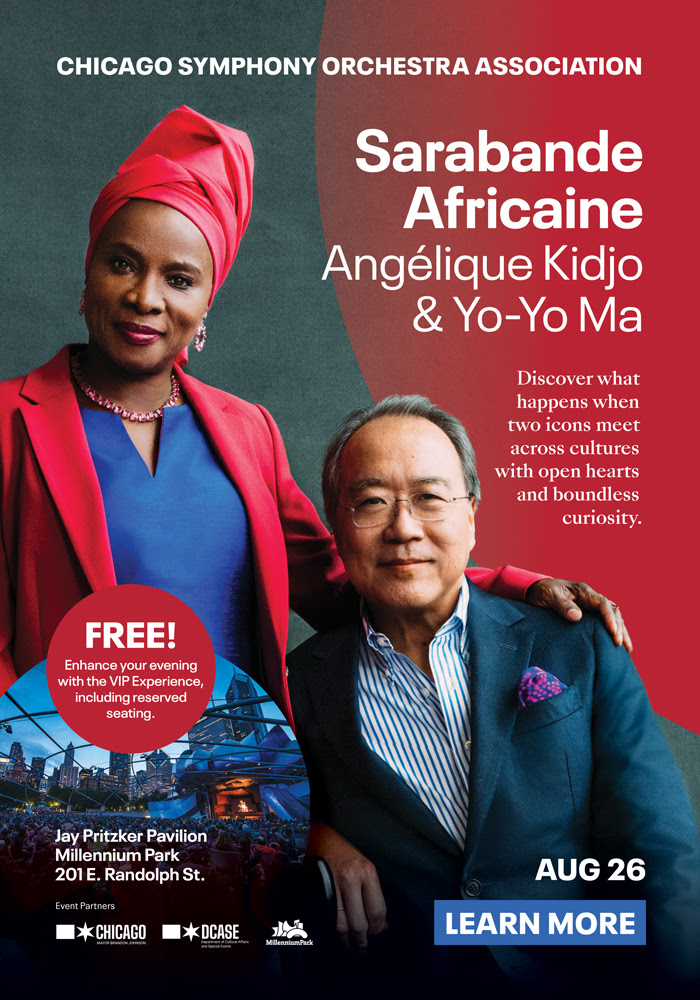 Classical meets West African magic when Yo‑Yo Ma and Angélique Kidjo share the stage for Sarabande Africaine — a free outdoor concert at Millennium Park. Expect a soul‑stirring evening where the elegance of the cello dances with the vibrant pulse of African song, uniting cultures, traditions, and generations.