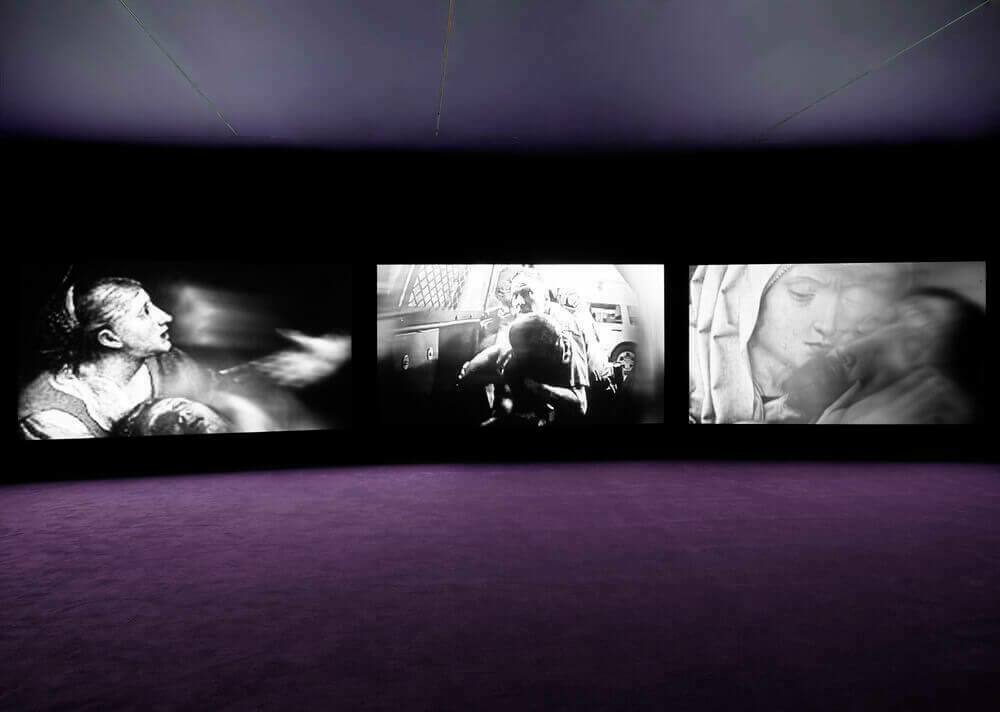 Moving across three screens, the artwork opens with details from Hieronymus Bosch’s oil painting The Conjurer (1502), in which the Dutch artist depicts how easily people are conned. Akomfrah then weaves together an extensive archive of images that mix iconic works of art with scenes shot and gathered in the globally fraught 18-month period between 2019 and 2021. The filmmaker combines what he calls “current emotional states”—sitting alone with one’s phone or staring out the window—with “states of emotions”—collective responses of protest or fear.