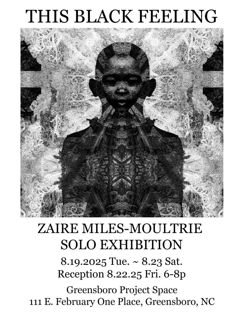 From August 19 through August 23, 2025, Greensboro Project Space will present This Black Feeling, a solo exhibition by artist Zaire Miles-MoultriE. Bringing together completed works, ongoing projects, and exploratory sketches, the exhibition offers a rare opportunity to witness the artist’s evolving practice firsthand.