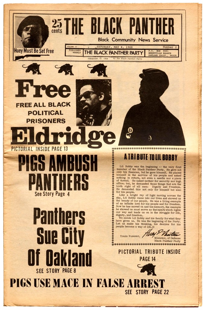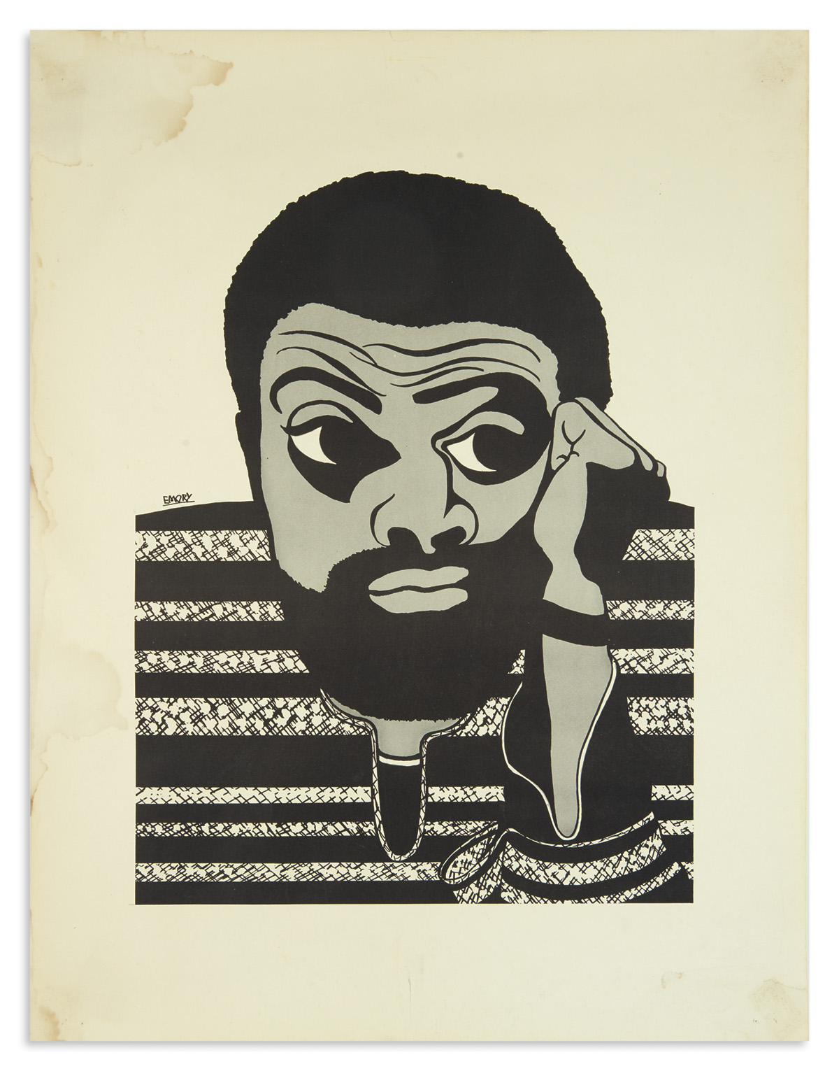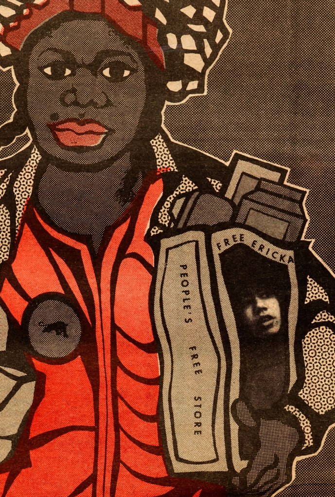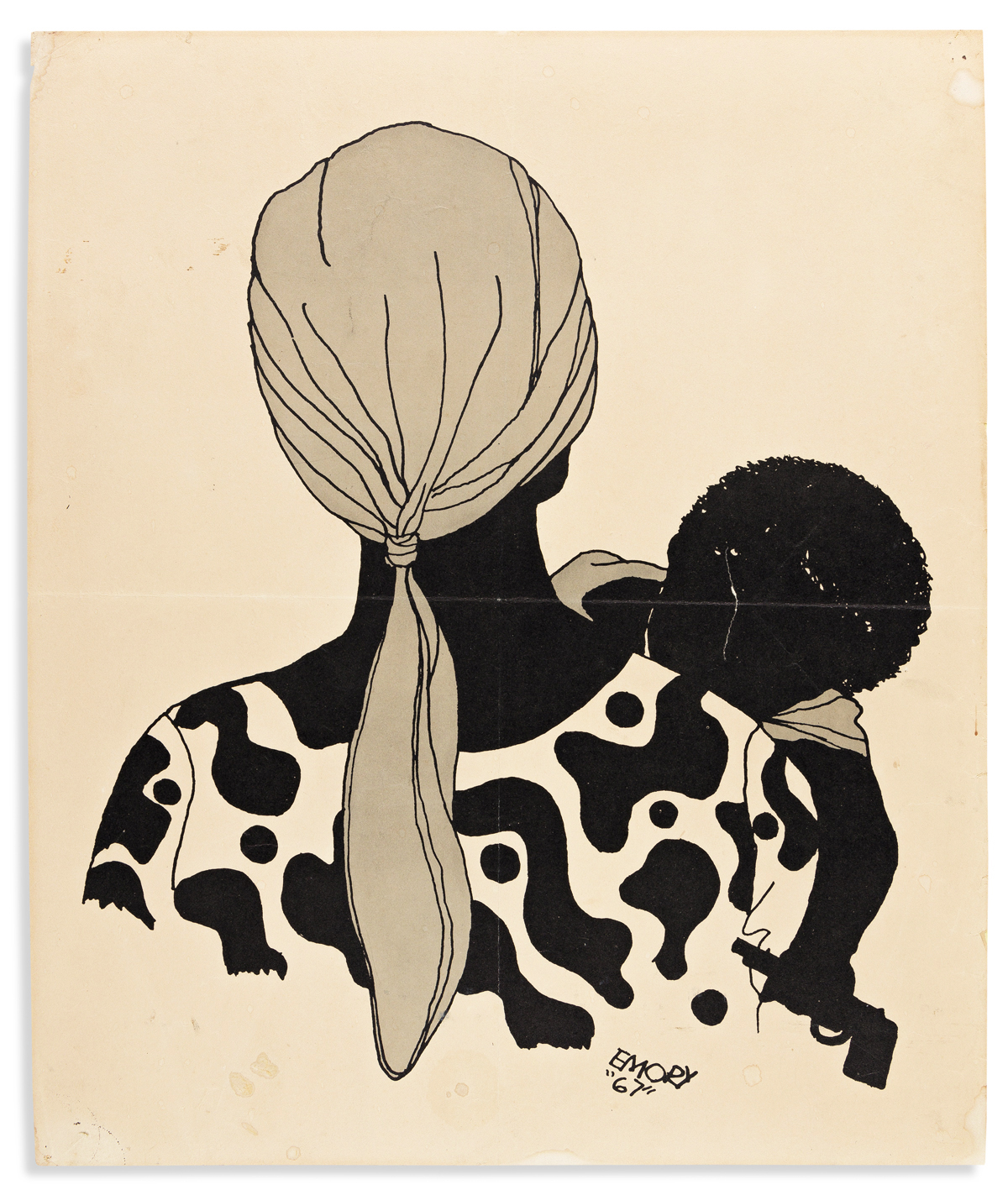 Artwork by Emory Douglas, 1969, published in the Black Panther | Beside her (scroll to the bottom of the image – right corner), text proclaiming “Afro-American solidarity with the oppressed People of the world” addresses the viewer in a no-nonsense, sans-serif font.Poster showing four women demonstrating for release of six members of the Black Panther Party from the Niantic State Women’s Farm in Connecticut 1972. Artist: Emory DouglasCommunity Newspaper, Back cover, The Black Panther , April 10, 1971, promoting the free food program and grocery store for Black people in poverty. Artist: Emory DouglasUntitled portrait of the revolutionary poet and playwright Leroi Jones or Amiri Baraka, circa 1968. | Artist: Emory Douglas(BLACK PANTHERS.) Emory Douglas, artist. Untitled print of a mother and armed child.Letterform Archive: “The Black Panther, May 4, 1968. An early issue reveals the edges and guidelines of cut-and-paste transfer lettering. Douglas typically kept font styles to a minimum, but this cover explodes with Futura, Alternate Gothic, Ultra Bodoni, Clarendon, and Compacta.”