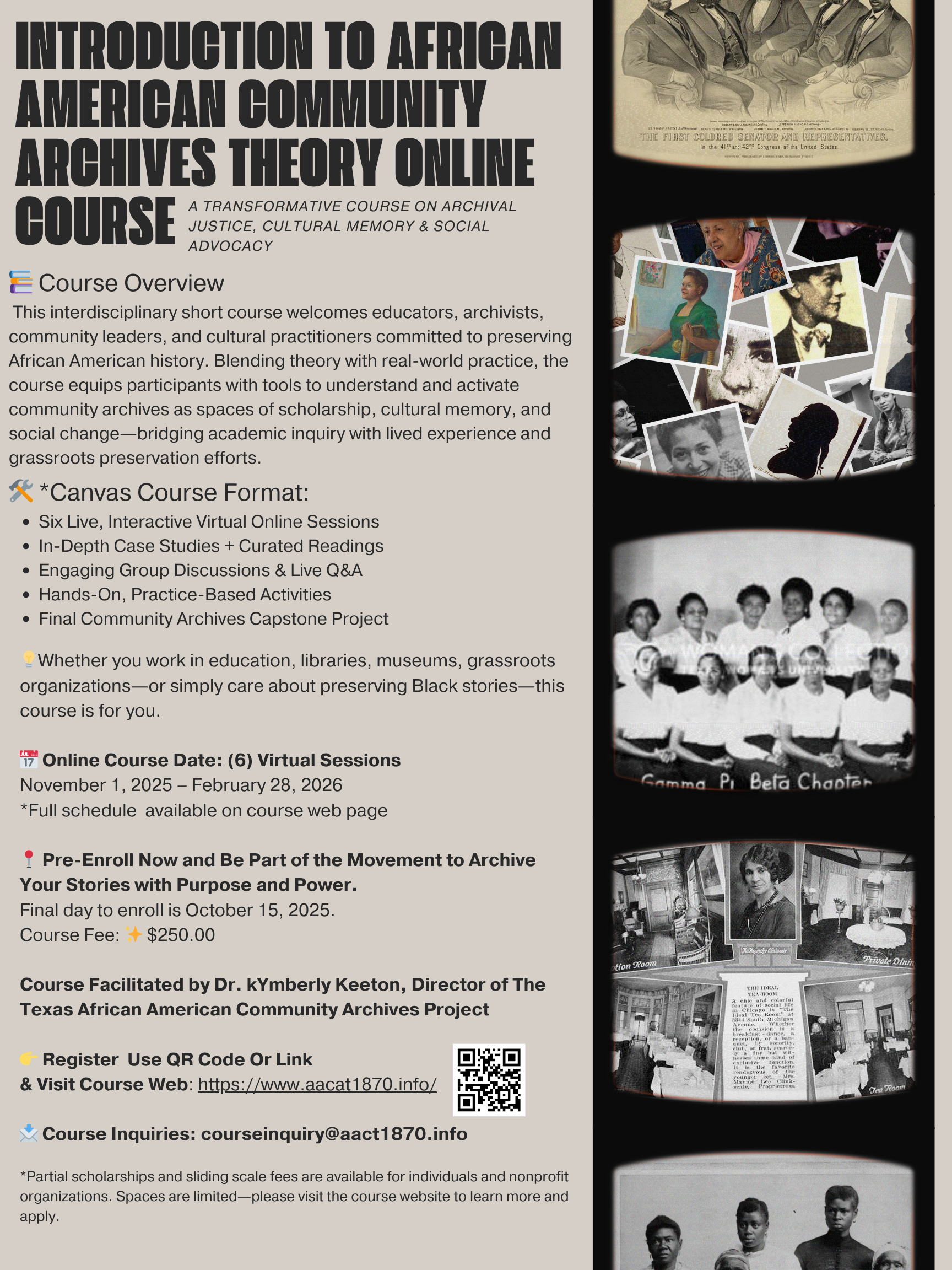 Enrollment opens on July 1, 2025, for the captivating course AACAT1870: Introduction to African American Community Archives Theory. This engaging, instructor-led online experience is tailored for educators, researchers, and community archivists eager to deepen their understanding. The course features six enlightening live sessions that delve into the rich tapestry of Black archival theory and practices. Join us on this insightful journey! Visit the course platform to discover the schedule, meet your instructor, explore the curriculum, and find all the registration details. Don’t miss this opportunity to expand your knowledge and impact!๐ View Course Details